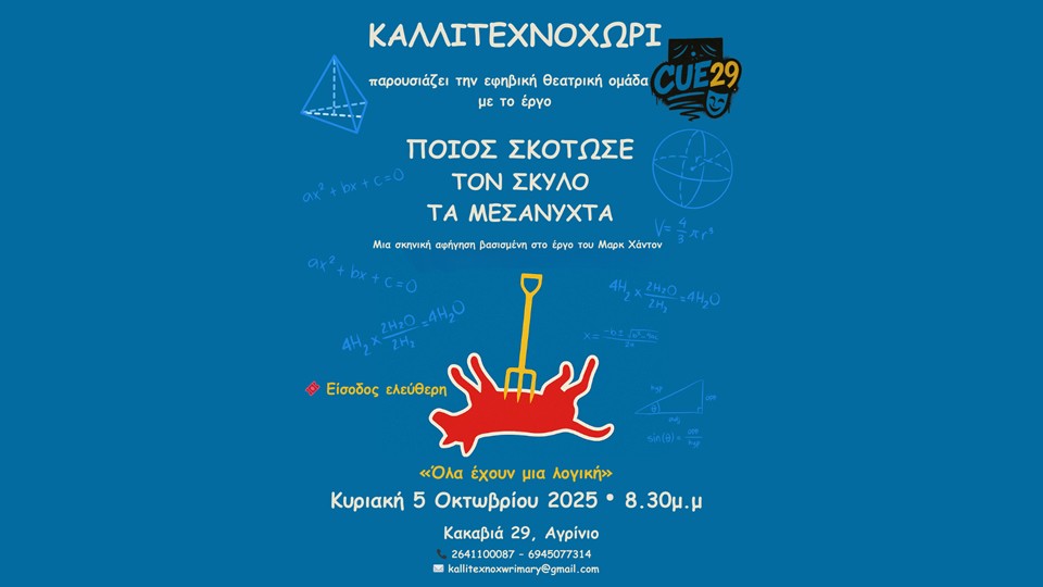 Κυριακή 5 Οκτωβρίου, 8:30 μ.μ. — Χώρος: Καλλιτεχνοχώρι, Κακαβιά 29, Αγρίνιο