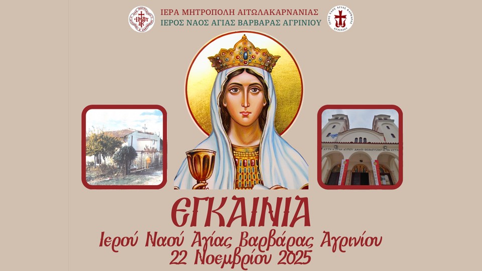 Με ιδιαίτερη χαρά ανακοινώνουμε στους ευσεβείς Χριστιανούς ότι το Σάββατο 22 Νοεμβρίου θα τελεσθούν τα Εγκαίνια του Ιερού Ναού της Αγίας Βαρβάρας Αγρινίου.