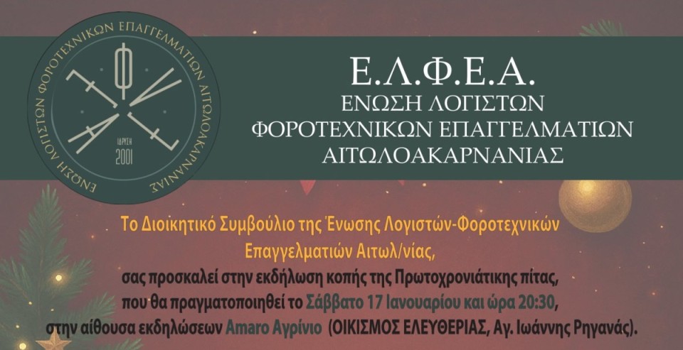 Στο πλαίσιο της ετήσιας κοπής της πρωτοχρονιάτικης πίτας, διοργανώνουμε χοροεσπερίδα με φαγητό και ζωντανή μουσική, η οποία θα πραγματοποιηθεί στις 17 Ιανουαρίου και ώρα 09:00 μ.μ. στην αίθουσα εκδηλώσεων του "Amaro" στο Αγρίνιο.