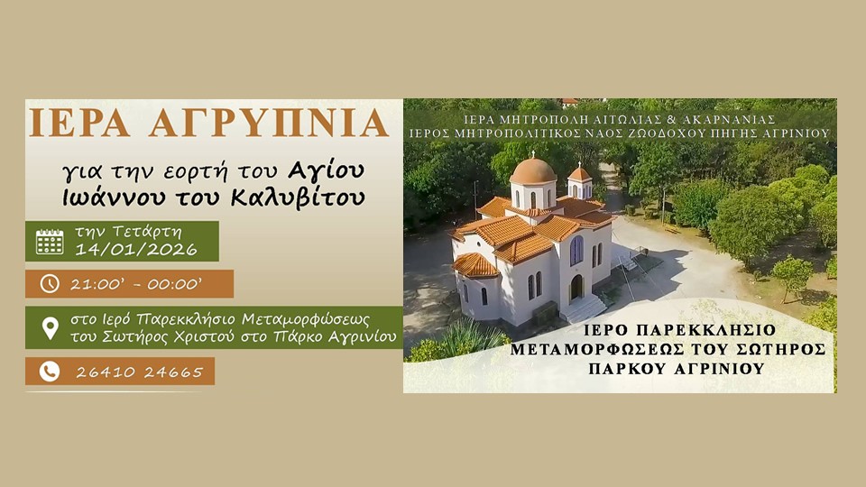 Την Τετάρτη 14 Ιανουαρίου 2026 στο Ιερό Παρεκκλήσιο Μεταμορφώσεως του Σωτήρος Χριστού που βρίσκεται εντός του Παπαστρατείου Δημοτικού Πάρκου Αγρινίου, θα τελεσθεί Ιερά Αγρυπνία για την εορτή του Οσίου Ιωάννου του Καλυβίτου, του διά Χριστόν πτωχού και θαυματουργού.