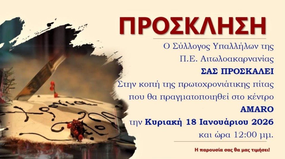 Στην κοπή της πρωτοχρονιάτικης πίτας του προσκαλεί ο Σύλλογος Υπαλλήλων Π.Ε. Αιτωλοακαρνανίας.