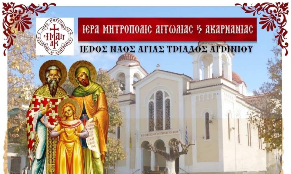 Το Εκκλησιαστικό Συμβούλιο του Ιερού Ναού Αγίας Τριάδος Αγρινίου σας προσκαλεί στην υποδοχή των Ιερών Λειψάνων των Αγίων Νεοφανών Μαρτύρων Ραφαήλ, Νικολάου και Ειρήνης, των εν Λέσβω μαρτυρησάντων, της Ιεράς Μητροπόλεως Μυτιλήνης, Ερεσσού και Πλωμαρίου, η οποία θα πραγματοποιηθεί τη Δευτέρα 2 Φεβρουαρίου 2026 και ώρα 17:00, στον Ιερό Ναό Αγίας Τριάδος Αγρινίου.