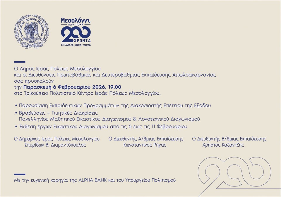 Η εκδήλωση θα πραγματοποιηθεί την Παρασκευή, 6 Φεβρουαρίου 2026 και ώρα 19:00, στο Τρικούπειο Πολιτιστικό Κέντρο Ιεράς Πόλεως Μεσολογγίου, όπου και θα παρουσιαστούν τα Εκπαιδευτικά Προγράμματα της Διακοσιοστής Επετείου της Εξόδου, ενώ θα ακολουθήσουν βραβεύσεις και τιμητικές διακρίσεις μαθητών που διακρίθηκαν στον Πανελλήνιο Μαθητικό Εικαστικό και Λογοτεχνικό Διαγωνισμό.