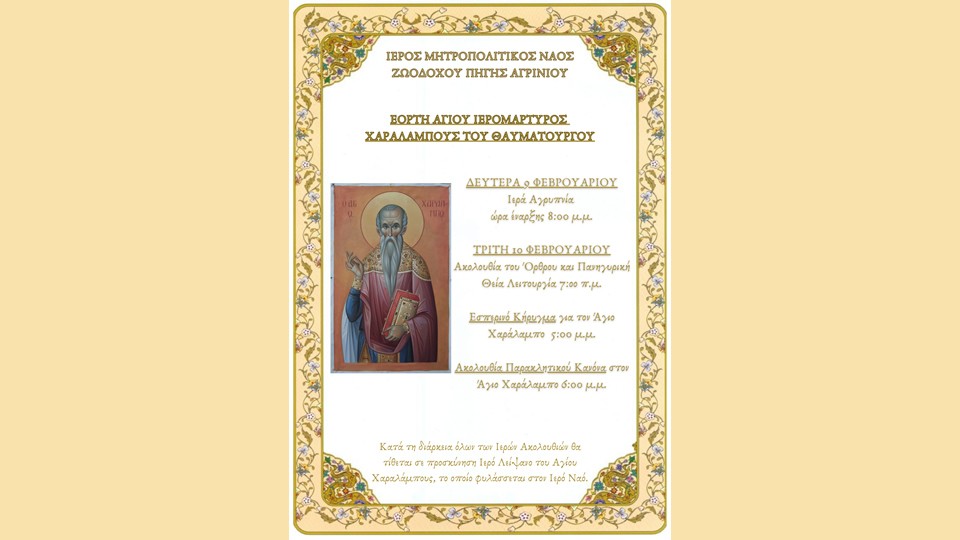 Την Τρίτη 10 Φεβρουαρίου 2026 η αγία μας Εκκλησία εορτάζει την ιερά μνήμη του Αγίου Ενδόξου Ιερομάρτυρος Χαραλάμπους του Θαυματουργού.