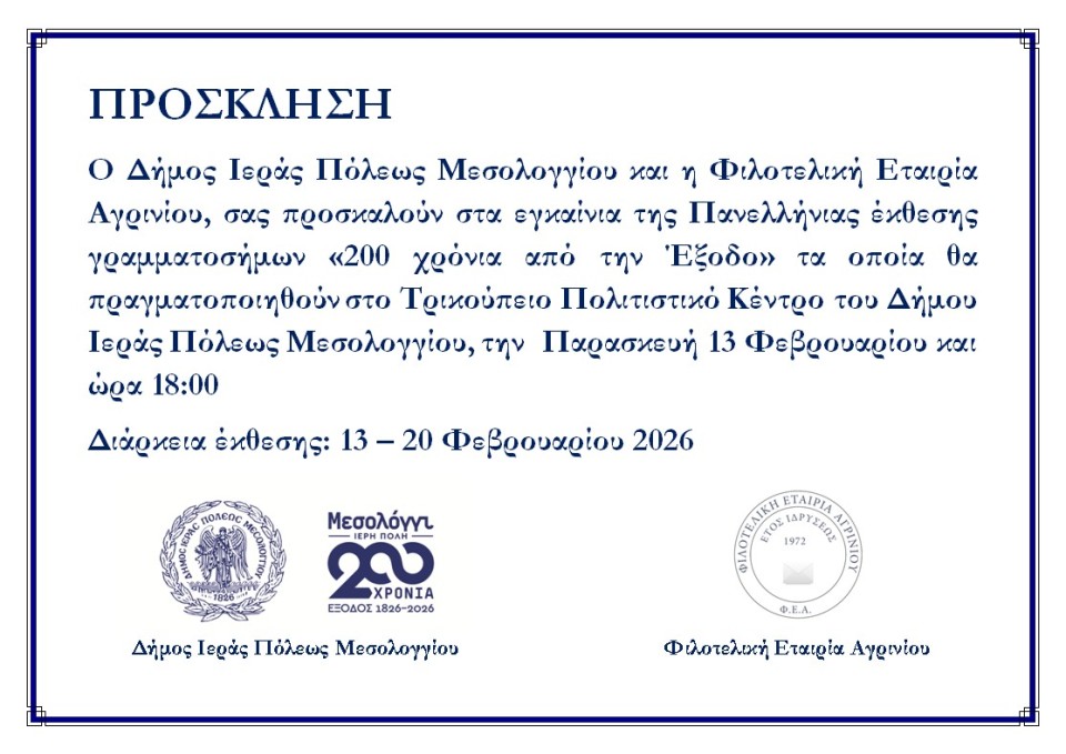 Ο Δήμος Ιεράς Πόλεως Μεσολογγίου και η Φιλοτελική Εταιρία Αγρινίου προσκαλούν όλους τους πολίτες και επισκέπτες της περιοχής να τιμήσουν με την παρουσία τους τα εγκαίνια και να επισκεφθούν την έκθεση.