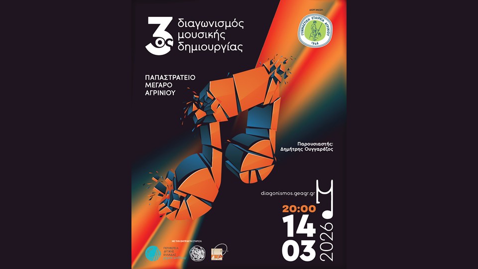 Ο 3ος Διαγωνισμός Μουσικής Δημιουργίας, που διοργανώνει η Γυμναστική Εταιρεία Αγρινίου σε συνεργασία με την Περιφέρεια Δυτικής Ελλάδας, το Δήμο Αγρινίου και την Π.Ε.Δ. Δυτικής Ελλάδας, έχει περάσει στην τελική του φάση και απομένουν λίγες ημέρες για τη διεξαγωγή του.