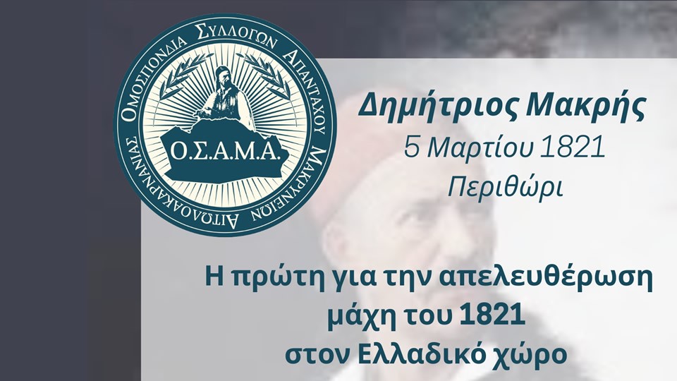 Η Ομοσπονδία Συλλόγων Απανταχού Μακρύνειων Αιτωλοακαρνανίας, σε συνεργασία με τον Δήμο Αγρινίου, σας προσκαλεί στην εκδήλωση Ιστορικής Μνήμης και Τιμής για την έναρξη της Ελληνικής Επανάστασης,