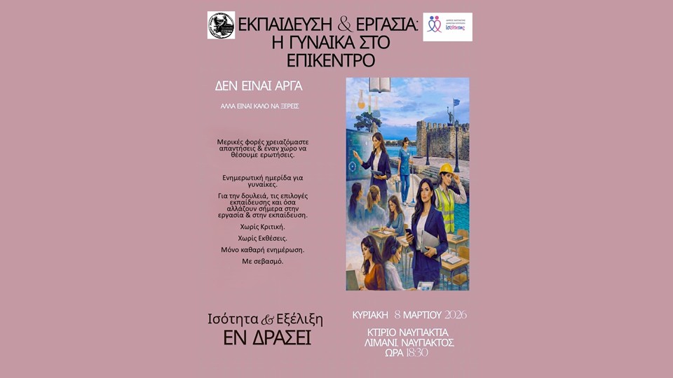 Δήμος Ναυπακτίας και Επιτροπή Ισότητας τιμούν την Ημέρα της Γυναίκας. Ημερίδα: «Εκπαίδευση και Εργασία: Η γυναίκα στο επίκεντρο» (Κυρ 8/3/2026 18:30)