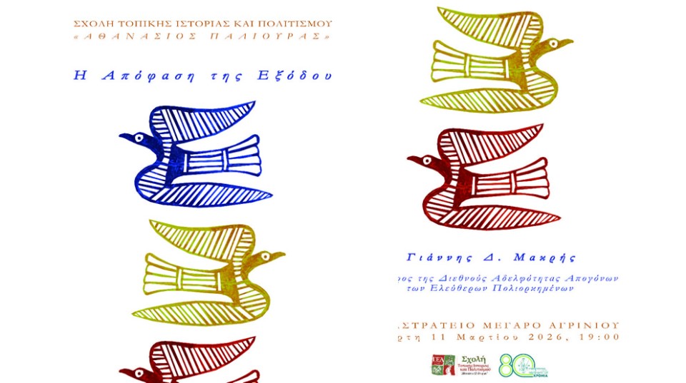Η Σχολή Τοπικής Ιστορίας και Πολιτισμού "Αθανάσιος Παλιούρας", της Γυμναστικής Εταιρείας Αγρινίου, παρουσιάζει την Τετάρτη 11 Μαρτίου 2026 και ώρα 19:00 στο Παπαστράτειο Μέγαρο Αγρινίου τον πρόεδρο της Διεθνούς Αδελφότητας Απογόνων των Ελεύθερων Πολιορκημένων Γιάννη Δ. Μακρή. Θέμα της ομιλίας του: "Η Απόφαση της Εξόδου".