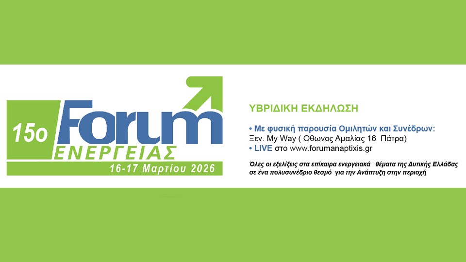 Το 15ο Forum Ενέργειας θα πραγματοποιηθεί στις 16 και 17 Μαρτίου 2026 στο ξενοδοχείο My Way στην Πάτρα (Λεωφ. Όθωνος-Αμαλίας 16) και διοργανώνεται από την οικονομική εφημερίδα «Σύμβουλος Επιχειρήσεων» και το Τεχνικό Επιμελητήριο Δυτικής Ελλάδας.