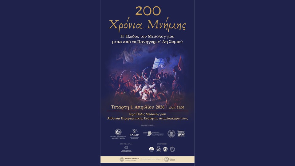 Στο πλαίσιο του εορτασμού της Διακοσιοστής Επετείου από την ηρωική Έξοδο, η Ιερή Πόλη του Μεσολογγίου υποδέχεται την Τετάρτη, 1 Απριλίου 2026 και ώρα 21:00, στην Αίθουσα της Περιφερειακής Ενότητας Αιτωλοακαρνανίας, μια ξεχωριστή δράση ιστορικής και λαογραφικής αφύπνισης.