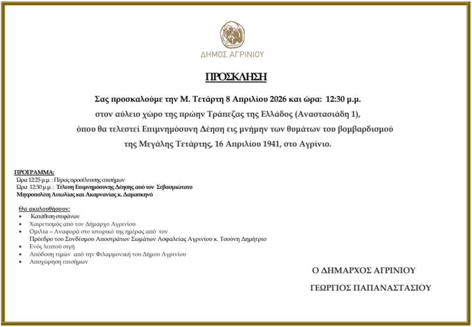 Ο Δήμος Αγρινίου τιμά τη μνήμη των θυμάτων του βομβαρδισμού της πόλης κατά τη διάρκεια του Β’ Παγκοσμίου Πολέμου και διοργανώνει επιμνημόσυνη δέηση την Μεγάλη Τετάρτη 8 Απριλίου 2026 και ώρα 12:30 μ.μ., στον αύλειο χώρο της πρώην Τράπεζας της Ελλάδος (Αναστασιάδη 1).