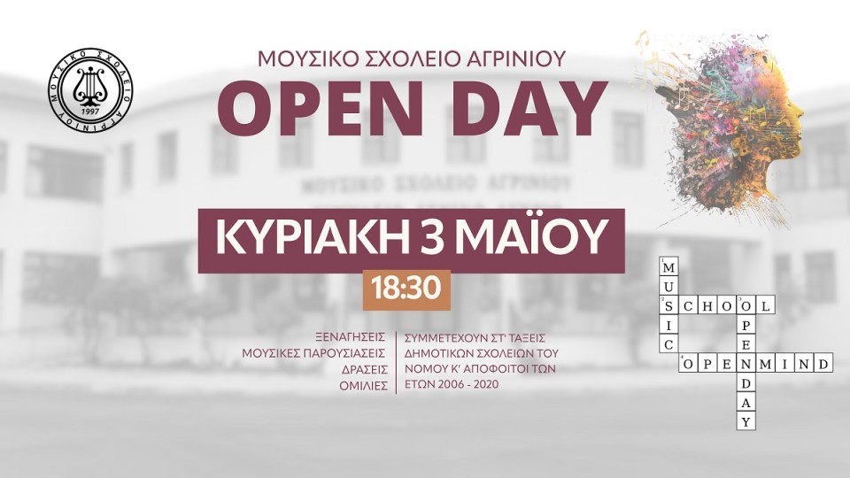Tο Μουσικό Σχολείο Αγρινίου ανοίγει τις πόρτες του και προσκαλεί γονείς, κηδεμόνες και μαθητές στην ετήσια Ημέρα Γνωριμίας- Open Day, η οποία θα πραγματοποιηθεί την Κυριακή 3 Μαΐου και ώρα 6:30 μ.μ. στο χώρο του σχολείου.