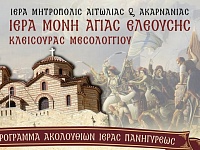 Από την Ιερά Μονή Αγίας Ελεούσης Κλεισούρας Μεσολογγίου ανακοινώνεται ότι, την Παρασκευή 27 Μαρτίου 2026 θα τελεσθεί Ιερά Αγρυπνία του Ακαθίστου. Η Ιερά Αγρυπνία θα ξεκινήσει 09:00 μ.μ. και θα τελειώσει 00:30 π.μ. Πληροφορίες το τηλέφωνο της Μονής : 2632022386