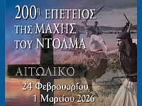 200 Χρόνια από τη Μάχη του Ντολμά Ο Δήμος Ιεράς Πόλεως Μεσολογγίου τιμά την Διακοσιοστή Επέτειο της Μάχης του Ντολμά με μια σειρά επετειακών εκδηλώσεων που θα πραγματοποιηθούν από τις 24 Φεβρουαρίου έως και την 1η Μαρτίου 2026. Αναλυτικά: Τρίτη 24 Φεβρουαρίου 2026 19:00 : «Έκθεση όπλων και…