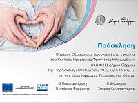 Πρόσκληση Ο Δήμος Θέρμου σας προσκαλεί στα εγκαίνια του Κέντρου Ημερήσιας Φροντίδας Ηλικιωμένων ( Κ.Η.Φ.Η.) Δήμου Θέρμου την Παρασκευή 31 Οκτωβρίου 2025 , ώρα 12:30 μ.μ. επί της οδού Χαριλάου Τρικούπη στο Θέρμο.