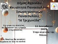 Δήμος ΑγρινίουΚοινότητα ΠαναιτωλίουΈνωση γυναικώνΠαναιτωλίου"Η Τριχωνίδα " 14 Δεκεμβρίου 2025Στην πλατεία της Μάνας Στο χώρο τις πλατείαςθα βρίσκεται και η άμαξατης σταχτοπούτας Ο Άι Βασίλης θα μοιράσει δωράκια σε όλα τα παιδιά 11η Γιορτή των Αστεριών 17:30 Άναμμα του δέντρου Θα συμμετέχουν τα… περισσότερα...