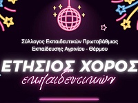 Στον ετήσιο χορό του προσκαλεί ο Σύλλογος Εκπαιδευτικών Αγρινίου – Θέρμου Π.Ε. «Κοσμάς ο Αιτωλός», που θα πραγματοποιηθεί το Σάββατο 31 Ιανουαρίου 2026. Σε ανακοίνωση που υπογράφουν η πρόεδρος, Συργιάννη Αγγελική – Ευθαλία και η γενική γραμματέας, Ράπτη Νίκη αναφέρεται: Αγαπητοί/ες…