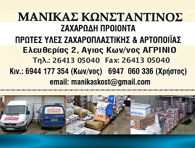 Η επιχείρηση Χονδρικού Εμπορίου και Διανομών του κου Μανίκα Κωνσταντίνου, έχει έδρα στο Αγιο Κωνσταντίνο Αγρινίου και λειτουργεί εδω και είκοσι χρόνια. Τα είδη που εμπορεύεται είναι κυρίως Πρώτες… περισσότερα...