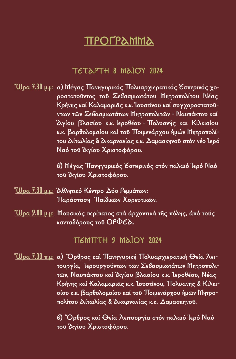 Ὁ Σεβασμιώτατος Μητροπολίτης Αιτωλίας & Ακαρνανίας κ.κ. Δαμασκηνὸς και ο Δήμαρχος Αγρινίου κ. Γεώργιος Παπαναστασίου σας προσκαλούν στις εορταστικές και λατρευτικές εκδηλώσεις προς τιμήν του Αγίου Ενδόξου Μεγαλομάρτυρος Χριστοφόρου, Προστάτου καὶ Πολιούχου της πόλεως του Αγρινίου, οι οποίες θα πραγματοποιηθούν από 8 έως 14 Μαΐου 2024.