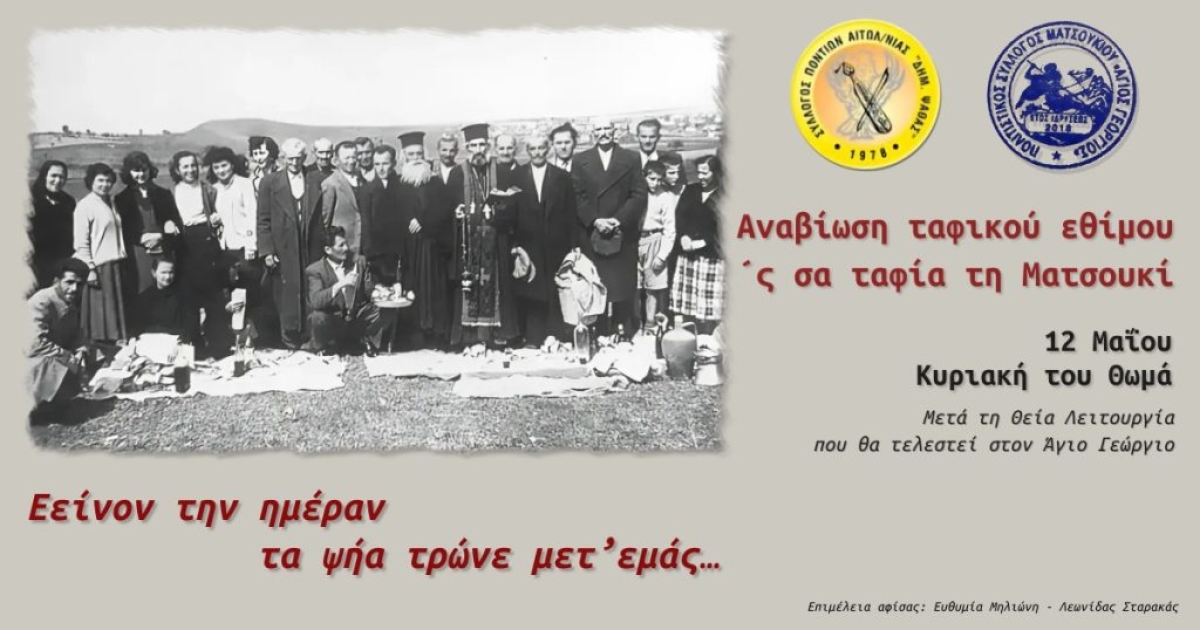 Ο Σύλλογος Ποντίων Αιτωλοακαρνανίας «Δημήτρης Ψαθάς» με τον Πολιτιστικό Σύλλογο Ματσουκίου «Άγιος Γεώργιος» θα αναβιώσουν το ποντιακό ταφικό έθιμο την Κυριακή του Θωμά (12 Μαίου) στο Ματσούκι του Δήμου Αγρινίου