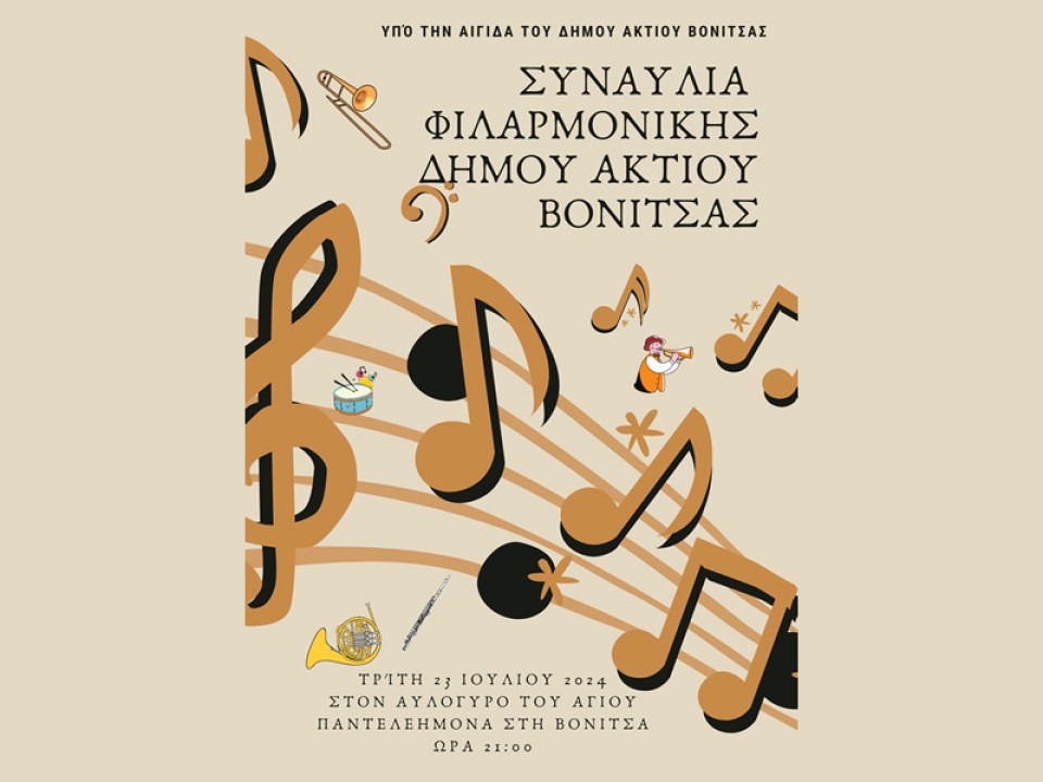 Συναυλία θα πραγματοποιήσει την Τρίτη 23 Ιουλίου 2024 η Φιλαρμονική του Δήμου Ακτίου Βόνιτσας, στις 21:00, στον αυλόγυρο της εκκλησίας του Αγίου Παντελεήμονα στη Βόνιτσα.