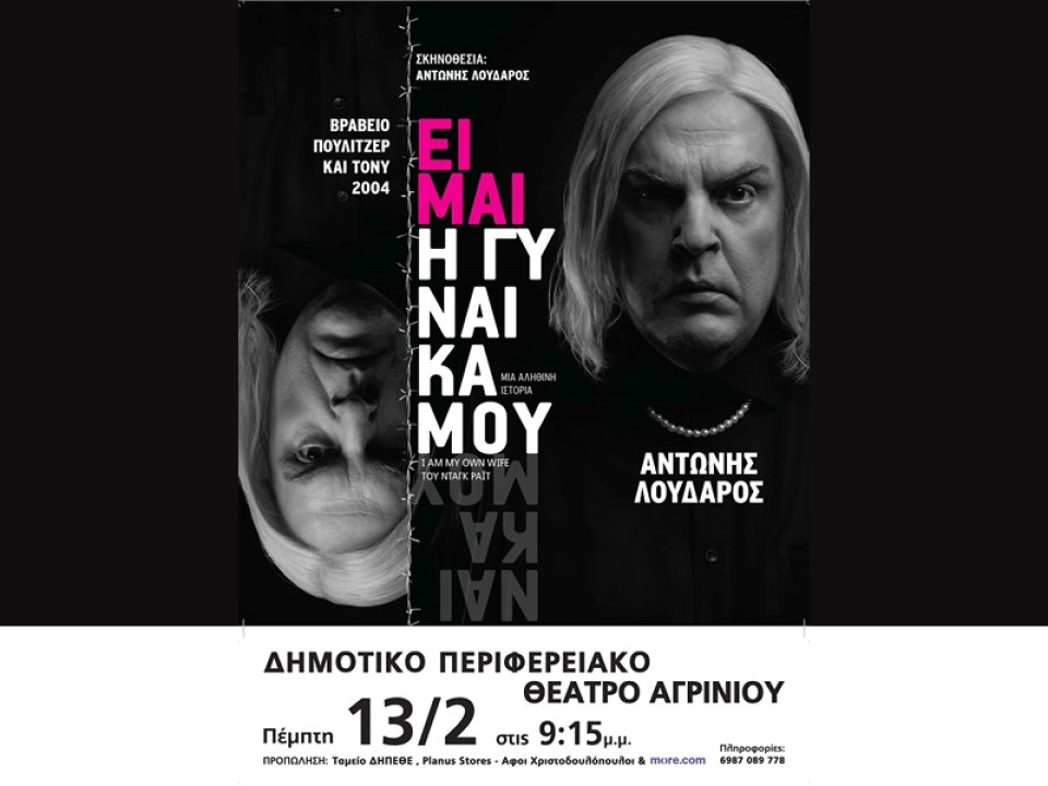 Με τη διπλή ιδιότητα του ερμηνευτή – σκηνοθέτη, ο ταλαντούχος ηθοποιός Αντώνης Λουδάρος, μετά τις καθηλωτικές παραστάσεις στην Αθήνα, φέρνει το βραβευμένο με Pulitzer και Tony θεατρικό μονόλογο του Doug Wright, «Είμαι η γυναίκα μου» στην αίθουσα του Δη.Πε.Θε. Αγρινίου, την Πέμπτη 13 Φεβρουαρίου 2025 στις 21:15.
