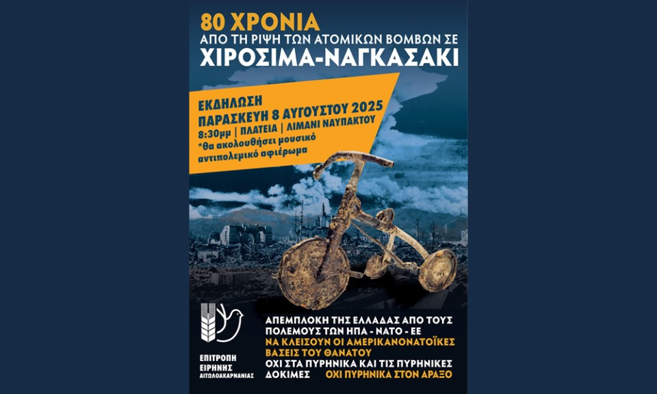 Όλες και Όλοι στην εκδήλωση για τα 80 χρόνια από την εγκληματική ρίψη των ατομικών βομβών στη Χιροσίμα και στο Ναγκασάκι.