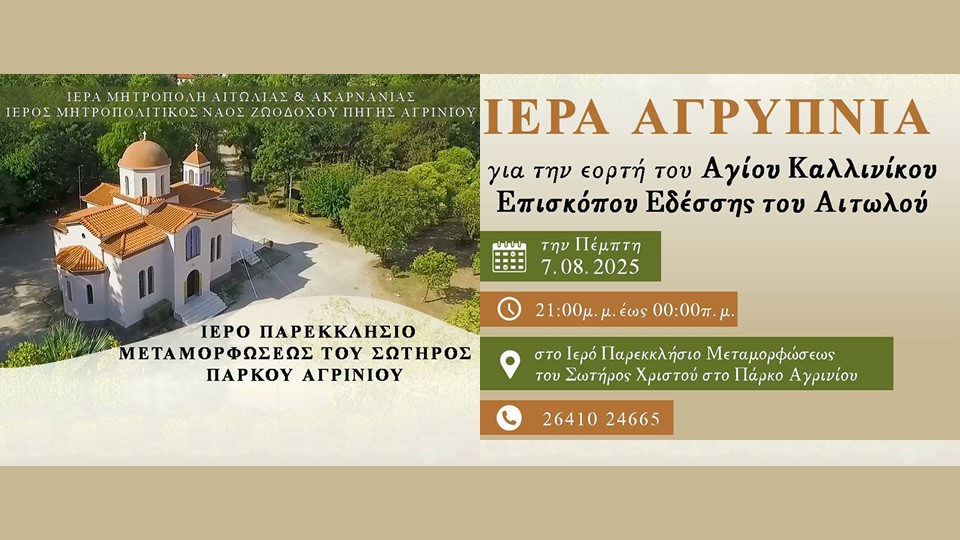 Στο Ιερό Παρεκκλήσιο Μεταμορφώσεως του Σωτήρος Χριστού Πάρκου Αγρινίου, θα τελεσθεί Ιερά Αγρυπνία για την εορτή του Αγίου Καλλινίκου, την Πέμπτη 7 Αυγούστου 2025.