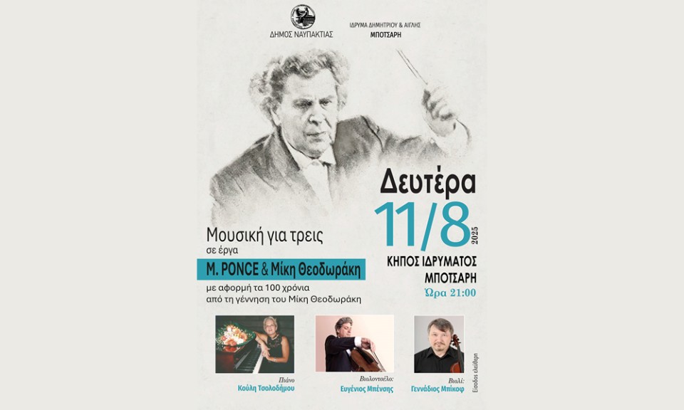 Στο πλαίσιο των εκδηλώσεων του Δήμου Ναυπακτίας για το Καλοκαίρι του 2025, και με αφορμή τη συμπλήρωση των 100 χρόνων από τη γέννηση του Μίκη Θεοδωράκη, παρουσιάζεται στον Κήπο του Αρχοντικού Μπότσαρη (Ιδρύματος Δημητρίου και Αίγλης Μπότσαρη), την Δευτέρα, 11 Αυγούστου 2025 και ώρα 21:00’, η μουσική εκδήλωση «Μουσική για Τρεις» με έργα M.PONCE και Μίκη Θεοδωράκη.