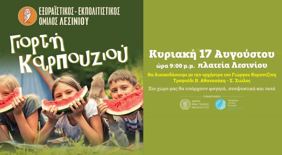 Ο Εξωραϊστικός Εκπολιτιστικός Όμιλος Λεσινίου τιμώντας το τοπικό προϊόν και συνεχίζοντας την παράδοση που έχει θεσπίσει τα τελευταία χρόνια, διοργανώνει για άλλη μια χρονιά την Γιορτή καρπουζιού την Κυριακή 17 Αυγούστου και ώρα 21:00 μ.μ. στην Κεντρική Πλατεία Λεσινίου.