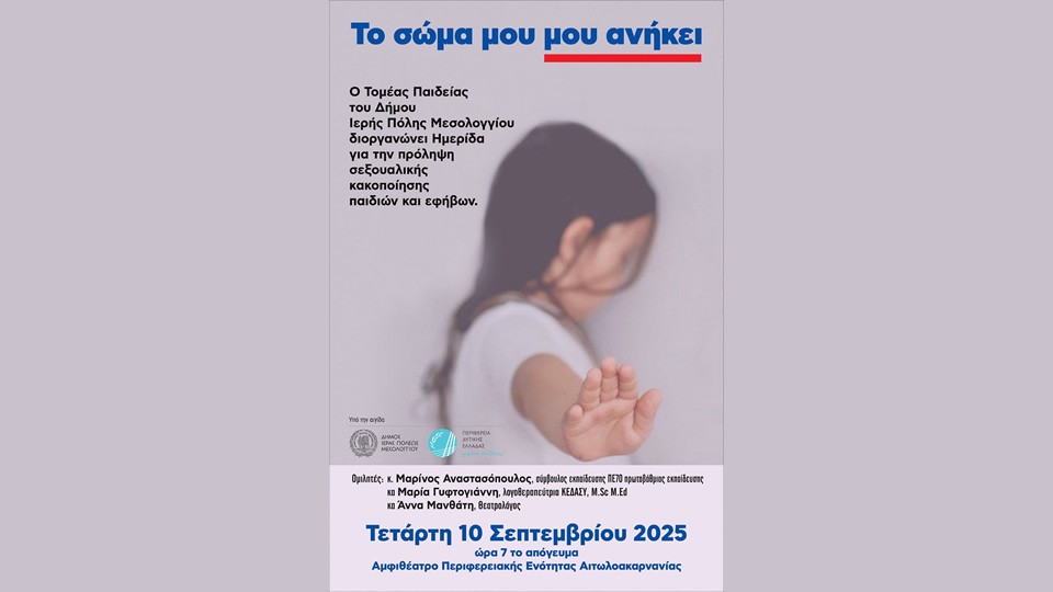 Ο Τομέας Παιδείας του Δήμου Ιερής Πόλης Μεσολογγίου διοργανώνει την ημερίδα «Το σώμα μου μου ανήκει», την Τετάρτη, 10 Σεπτεμβρίου 2025 στις 19:00, στο Αμφιθέατρο της Περιφερειακής Ενότητας Αιτωλοακαρνανίας (Κύπρου 30, Μεσολόγγι).