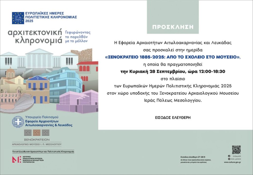 Στο Ξενοκράτειο Αρχαιολογικό Μουσείο στο Μεσολόγγι θα πραγματοποιηθεί η ημερίδα «ΞΕΝΟΚΡΑΤΕΙΟ 1885-2025: ΑΠΟ ΤΟ ΣΧΟΛΕΙΟ ΣΤΟ ΜΟΥΣΕΙΟ», η οποία, έχει στόχο την ανάδειξη του Ξενοκρατείου, κηρυγμένου ως μνημείου, και από το 2021 Κεντρικού Αρχαιολογικού Μουσείου της Π.Ε. Αιτωλοακαρνανίας, ως σημαντικού μέρους της αρχιτεκτονικής κληρονομιάς και της συλλογικής μνήμης της Ιεράς Πόλης του Μεσολογγίου.