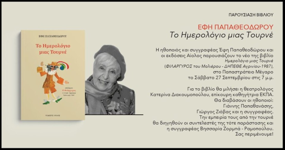 Η ηθοποιός και συγγραφέας Έφη Παπαθεοδώρου και οι εκδόσεις «Αίολος» παρουσιάζουν το νέο της βιβλίο «Ημερολόγιο μιας Τουρνέ» (ΦΙΛΑΡΓΥΡΟΣ του