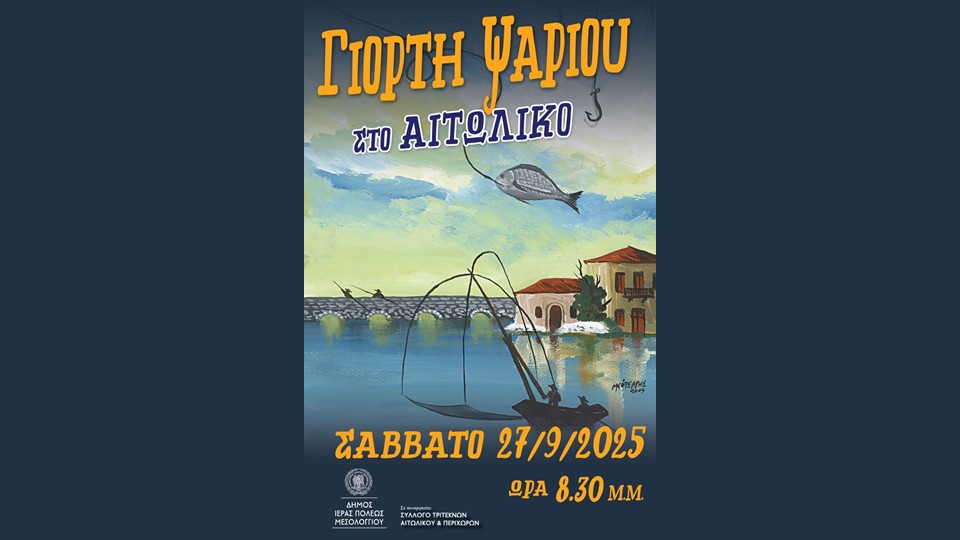 Ο Δήμος Ιερής Πόλης Μεσολογγίου και ο Σύλλογος Τριτέκνων Αιτωλικού και Περιχώρων προσκαλούν όλους τους φίλους της καλής παρέας και της τοπικής γαστρονομίας στην Γιορτή Ψαριού, μια μοναδική εκδήλωση που προάγει τον πολύτιμο θησαυρό της Λιμνοθάλασσας του Αιτωλικού, το Σάββατο 27 Σεπτεμβρίου 2025, στις 20:30, στις γραφικές γειτονιές του Αιτωλικού.