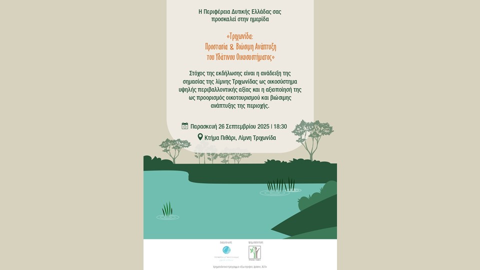 Εκδήλωση με θέμα: "Τριχωνίδα: Προστασία & Βιώσιμη Ανάπτυξη του Υδάτινου Οικοσυστήματος", διοργανώνει η Περιφέρεια Δυτικής Ελλάδας, την Παρασκευή 26 Σεπτεμβρίου 2025 και ώρα 18.30 στη λίμνη Τριχωνίδα (Κτήμα Πιθάρι), στο πλαίσιο της πρωτοβουλίας "Οικονομική Υποστήριξη Εξωστρεφών Δράσεων 2025" του Πράσινου Ταμείου.