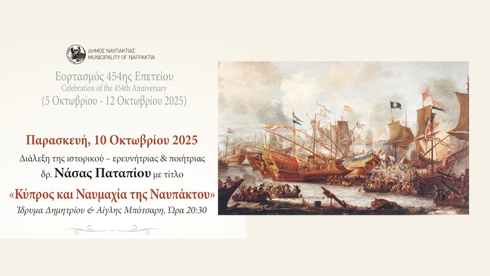 Ο Δήμος Ναυπακτίας ενημερώνει ότι, στο πλαίσιο των Εορτασμών της 454ης Επετείου της Ναυμαχίας της Ναυπάκτου η ιστορικός-ερευνήτρια και ποιήτρια Δρ.Νάσα Παταπίου θα πραγματοποιήσει διάλεξη με θέμα «Κύπρος και Ναυμαχία της Ναυπάκτου» την Παρασκευή, 10 Οκτωβρίου 2025 και ώρα 20:30’ στο Ίδρυμα Δημητρίου και Αίγλης Μπότσαρη.