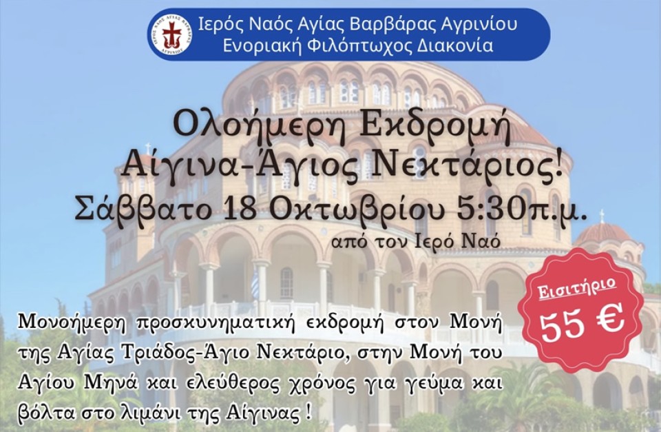 Ο Ι. Ν. Αγίας Βαρβάρας Αγρινίου διοργανώνει μονοήμερη εκδρομή το Σάββατο 18 Οκτωβρίου στην Αίγινα, στο νησί του Αγίου Νεκταρίου