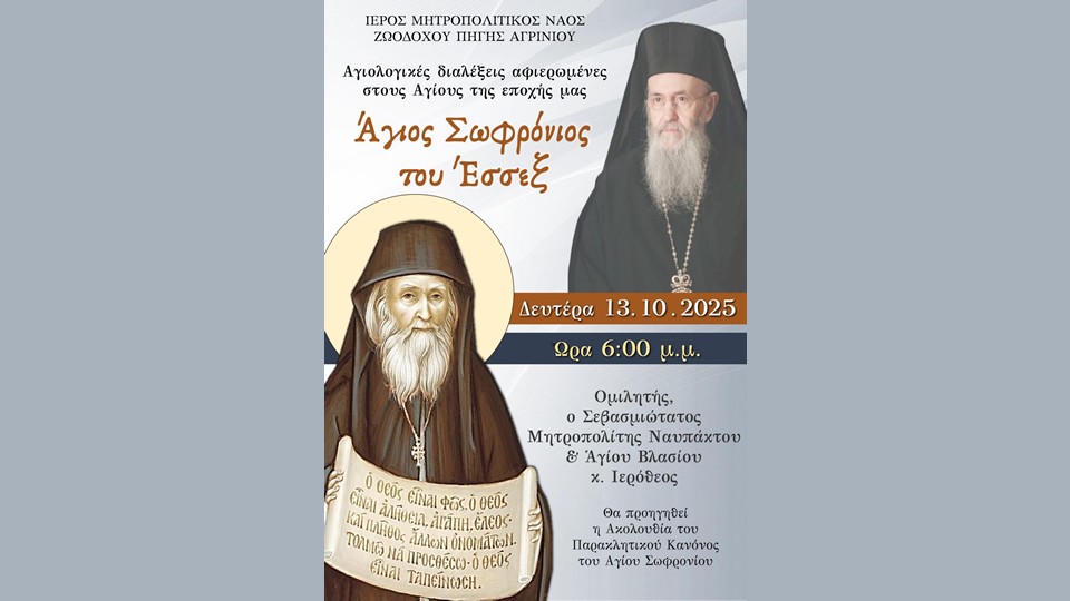 Με ομιλητή τον Σεβασμιώτατο Μητροπολίτη Ναυπάκτου και Αγίου Βλασίου κ. Ιερόθεο θα πραγματοποιηθεί η Α’ Αγιολογική Διάλεξη στον Ιερό Μητροπολιτικό Ναό Ζωοδόχου Πηγής Αγρινίου σήμερα, Δευτέρα 13 Οκτωβρίου 2025 και ώρα 6:00΄ το απόγευμα.