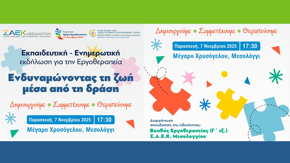 Βοηθός Εργοθεραπείας (Γ’ εξ.) της Σ.Α.Ε.Κ. Μεσολογγίου, σε συνεργασία με το Κέντρο Ημέρας