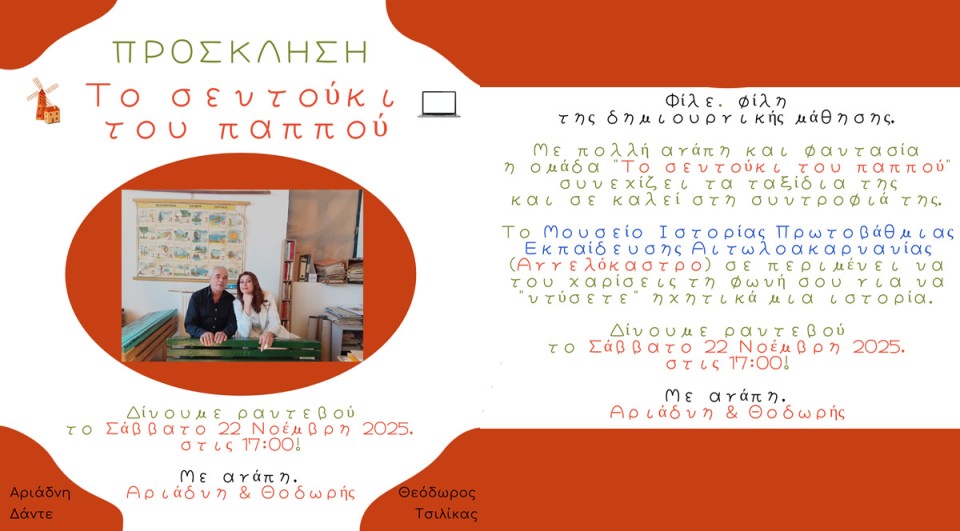 Η δημιουργική ομάδα "Το σεντούκι του παππού" σας προσκαλεί στο Μουσείο Ιστορίας Πρωτοβάθμιας Εκπαίδευσης Αιτωλοακαρνανίας (Αγγελόκαστρο) για ένα εργαστήρι δημιουργικής μάθησης που συνδυάζει την αγάπη για την Ποίηση και την Τεχνολογία.