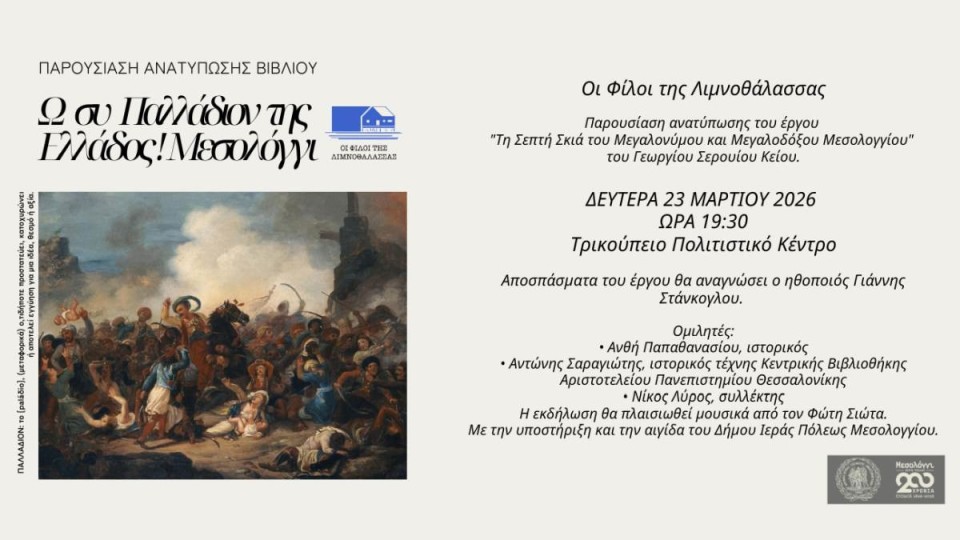 Η εκδήλωση θα πραγματοποιηθεί τη Δευτέρα 23 Μαρτίου 2026 και ώρα 19:30, στο Τρικούπειο Πολιτιστικό Κέντρο.