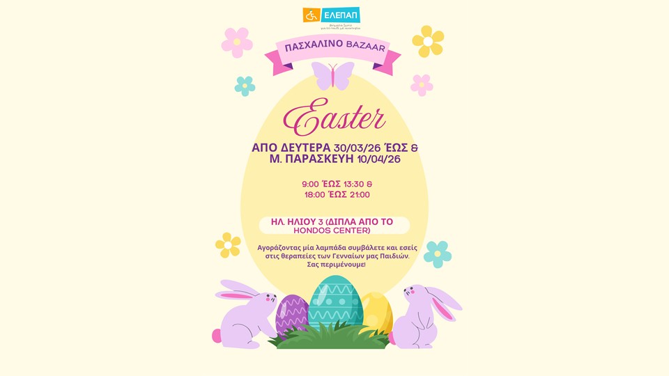 Με μεγάλη χαρά σας περιμένουμε στο κέντρο της πόλης μας για το πασχαλινό Bazaar της ΕΛΕΠΑΠ Αγρινίου, από Δευτέρα 30/3/26 έως και M. Παρασκευή 10/4/2026.