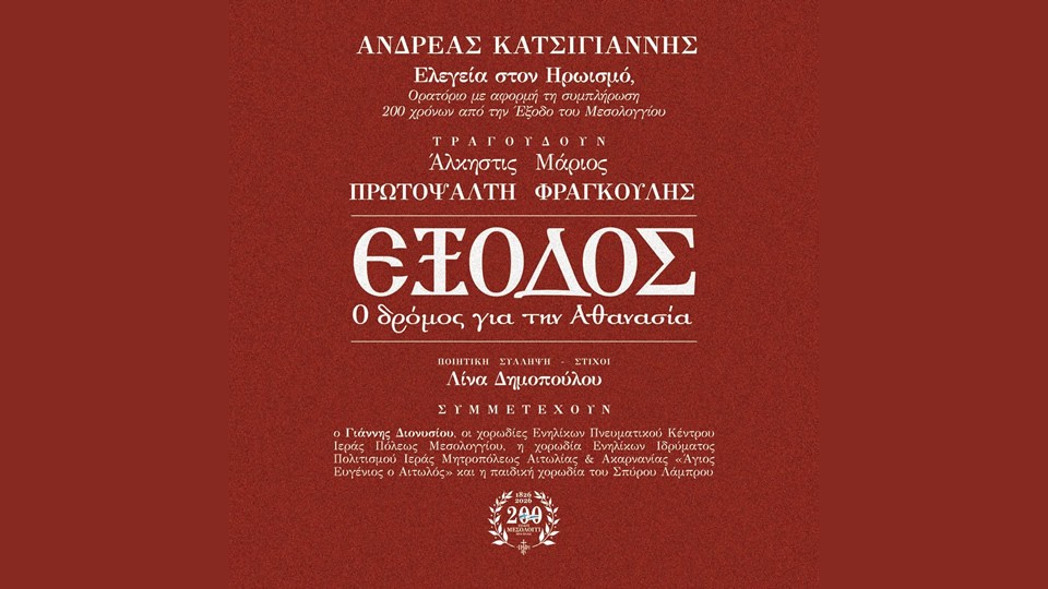 Η Ιερά Μητρόπολις Αιτωλίας και Ακαρνανίας, με αίσθημα ιστορικής ευθύνης και βαθιά συνείδηση της πνευματικής της αποστολής, τιμά τη συμπλήρωση 200 ετών από την Έξοδο του Μεσολογγίου με την παρουσίαση ενός κορυφαίου πρωτότυπου καλλιτεχνικού έργου, το οποίο θα μετατρέψει τη μνήμη σε βίωμα και την ιστορία σε εσωτερική εμπειρία. Σε μια εποχή όπου οι αξίες δοκιμάζονται, η Εκκλησία, αναλαμβάνει την πρωτοβουλία να αναδείξει το διαχρονικό μήνυμα της θυσίας, της ελευθερίας και της ανθρώπινης αξιοπρέπειας, μέσα από το ορατόριο του συνθέτη Ανδρέα Κατσιγιάννη.