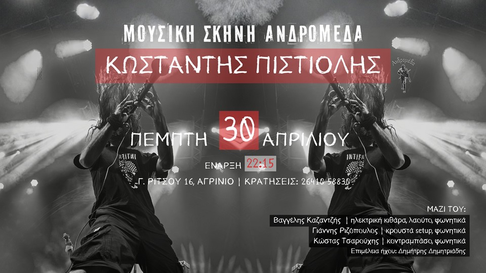 Ο Κωσταντής Πιστιόλης εμφανίζεται στη Μουσική Σκηνή Ανδρομέδα την Πέμπτη 30 Απριλίου, παρουσιάζοντας τραγούδια από τη δισκογραφία του και από τις μουσικές διαδρομές που μέχρι σήμερα έχει χαράξει.