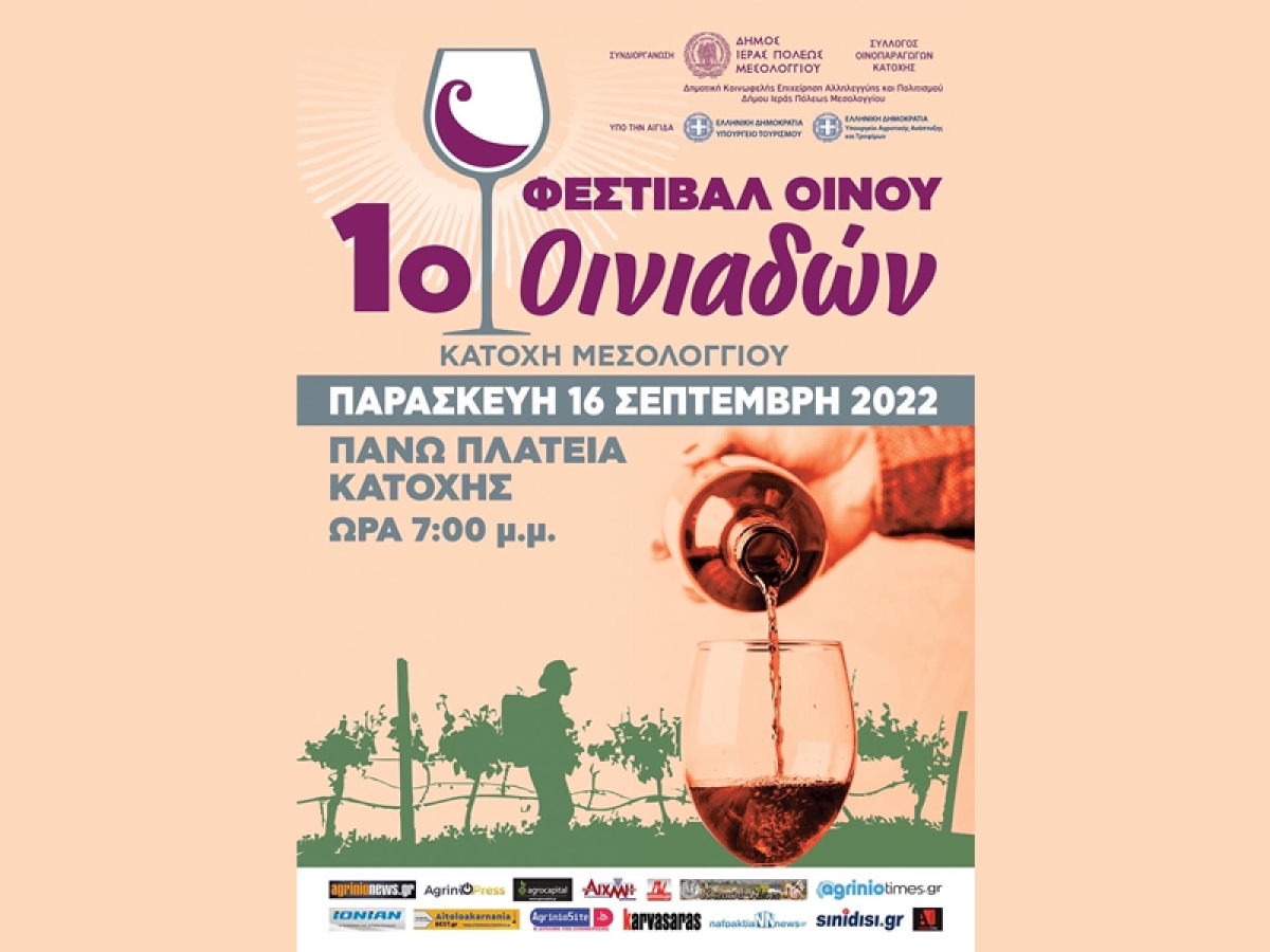 Ο Δήμος Ι.Π. Μεσολογγίου σας προσκαλεί και σας περιμένει στην ιστορική και όμορφη κωμόπολη της Κατοχής να απολαύσετε ντόπιες ποικιλίες όπως η ξακουστή Μαλαγουζιά, το Μαυρούδι Οινιαδών, το Αυγουστολίδη ή Γουστολίδη και η Μαυροδάφνη όπου ντόπιοι παραγωγοί θα σας καλέσουν να δοκιμάσετε και μετά όλοι μαζί να γιορτάσουμε την παραγωγή μας συνοδεία μουσικής.