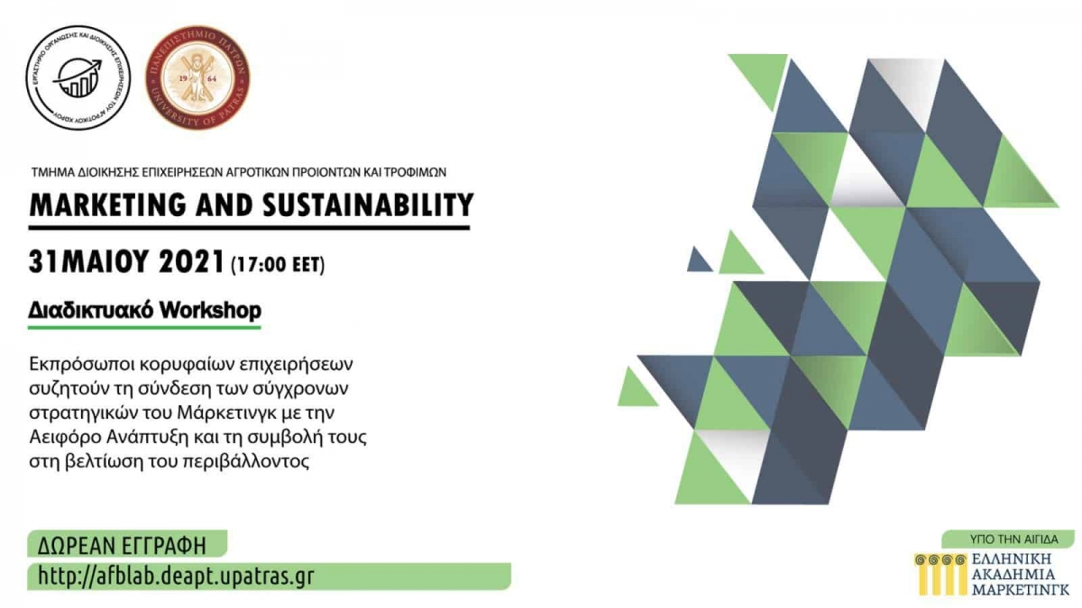 Το Εργαστήριο Οργάνωσης και Διοίκησης Επιχειρήσεων του Αγροτικού Χώρου, του Τμήματος Διοίκησης Επιχειρήσεων Αγροτικών Προϊόντων και Τροφίμων του Πανεπιστημίου Πατρών, στο πλαίσιο των δραστηριοτήτων που αναπτύσσει για τη διάχυση της γνώσης προς την κοινωνία και την εξωστρέφειά του διοργανώνει διαδικτυακό Workshop με θέμα “Marketing & Sustainability” στις 31 Μαΐου 2021 (17:00 μμ).