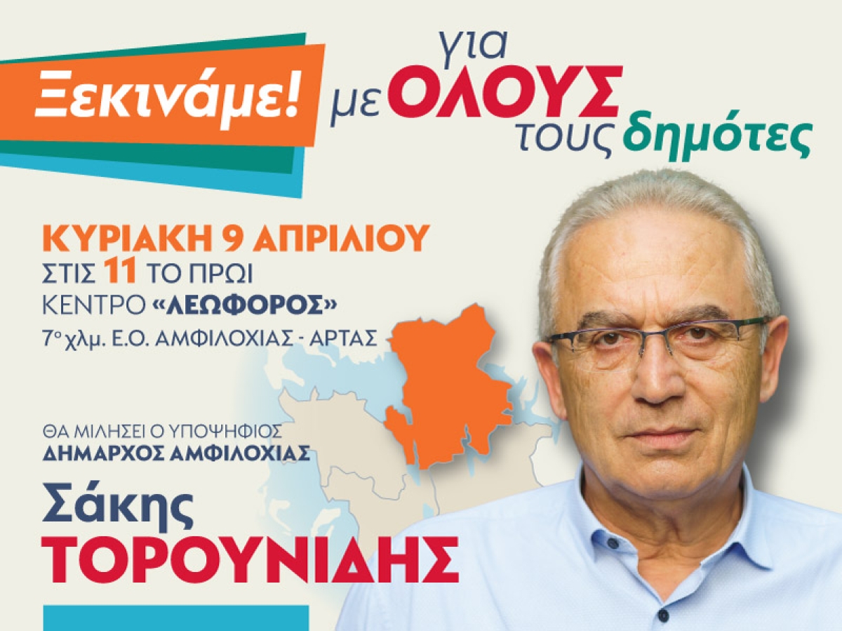 Με στόχο έναν δήμο για όλους, ο Σάκης Τορουνίδης δημοσιοποίησε την απόφαση του να διεκδικήσει στις προσεχείς δημοτικές εκλογές τον Δήμο Αμφιλοχίας. Μάλιστα, θα ανακοινώσει και επισήμως την υποψηφιότητά του σε μεγάλη συγκέντρωση που θα πραγματοποιηθεί την Κυριακή 9 Απριλίου.