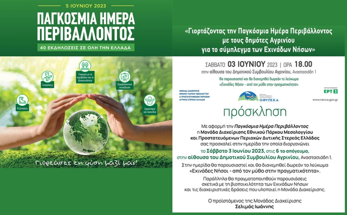 Με αφορμή την Παγκόσμια Ημέρα Περιβάλλοντος η Μονάδα Διαχείρισης Εθνικού Πάρκου Μεσολογγίου και Προστατευόμενων Περιοχών Δυτικής Στερεάς Ελλάδας διοργανώνει το Σάββατο, 3 Ιουνίου, στις 6 το απόγευμα, Ημερίδα στην αίθουσα Δημοτικού Συμβουλίου Αγρινίου.
