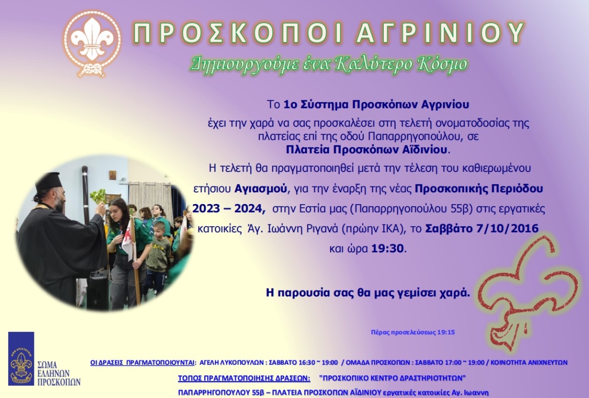 Το 1ο Σύστημα Προσκόπων Αγρινίου προσκαλεί στην τελετή ονοματοδοσίας της πλατείας επί της οδού Παπαρρηγοπούλου, σε Πλατεία Προσκόπων Αϊδινίου.